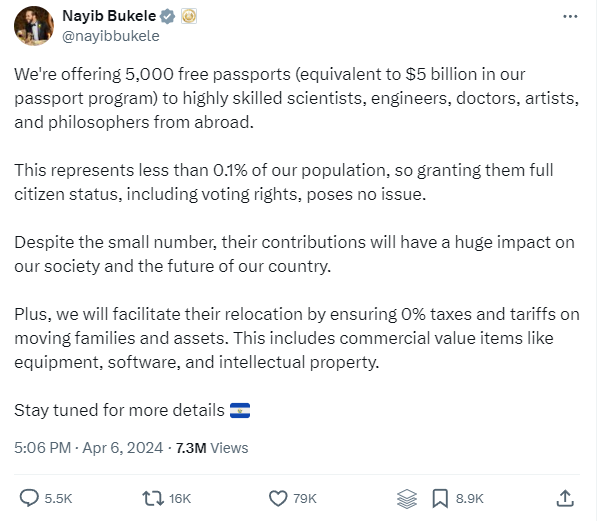 The President of El Salvador is actively recruiting talent to a country with great aspirations but no competitive advantage. Will this talent extend innovation in the US, in the same time zone, and interconnected with the fastest satellites?