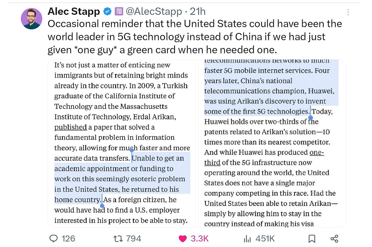 The United States could have been the world leader in 5G technology instead of China if we had just given Erdal Arıkan a green card when he needed one. (Alec Stapp)